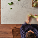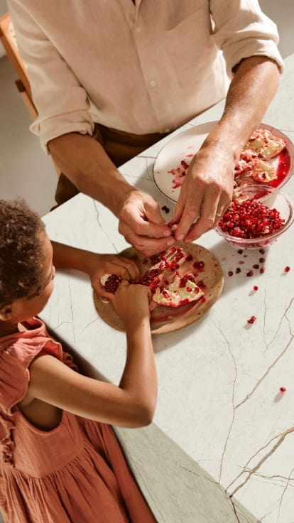 ילדה ואבא מבשלים במטבח על משטח שיש אבן קיסר פורצלן דגם isobilia 508