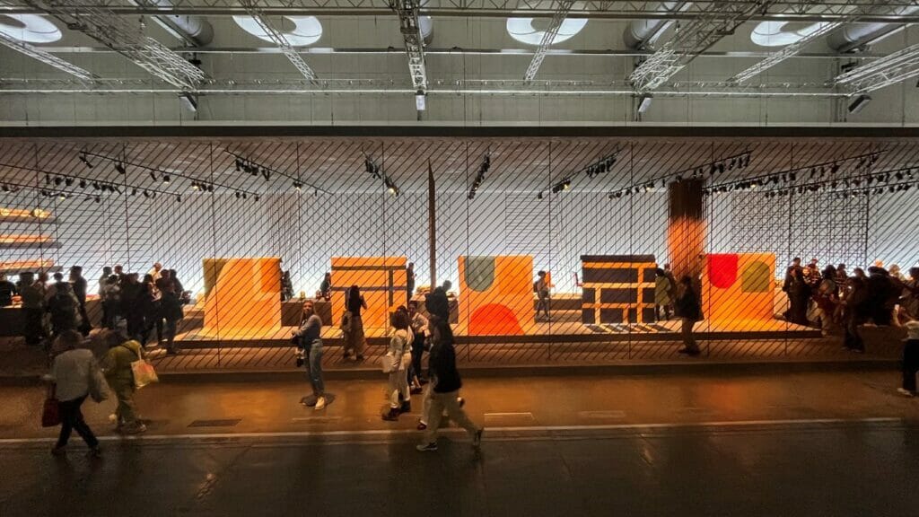 התצוגה של הרמס משכה בלטה גם השנה. מותג היוקרה הצרפתי הציג את קולקציית הטקסטיל וכלי הבית שלו על בסיסי בטון עבים, בתוך כלוב גיאומטרי שנוצר ממוטות ברזל תעשייתיים. המיצב חגג את הפשטות וביטא את מה שהוגדר כ״מה שחיוני באמת״: שטיחים גדולים מעוטרים בצורות גרפיות רקומות, ספות צמר וכותנה, מנורות זכוכית בסגנון עששיות וכלי פורצלן מאוירים במוטיבים של עולם הרכיבה, המהדהד את ההיסטוריה של הרמס. עם סיום שבוע העיצוב כל חלק מהמיצב אמור לעבור מיחזור ושימוש מחדש.