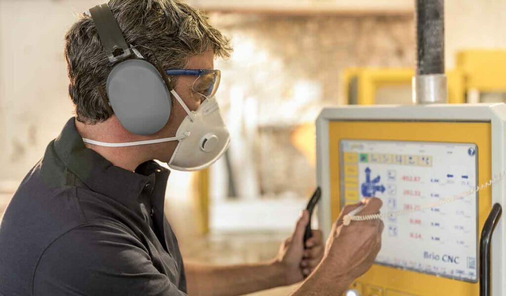 עובד במפעל בתהליך חיתוך של משטח אבן קיסר