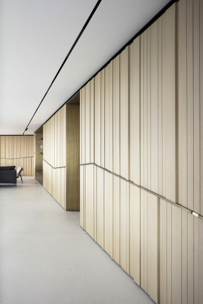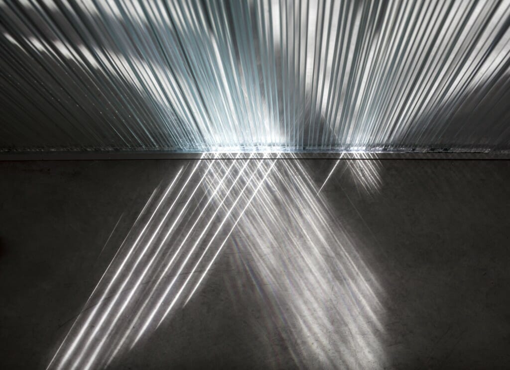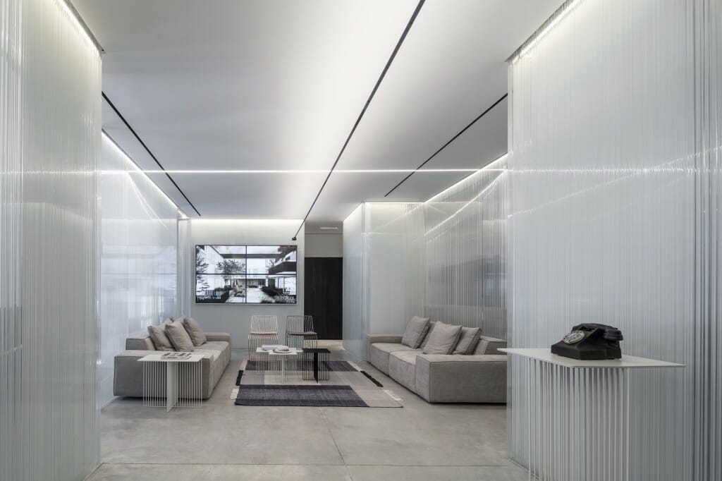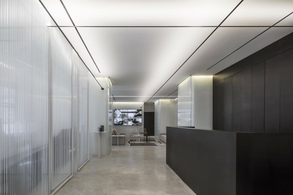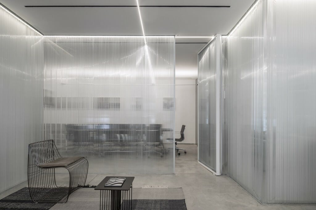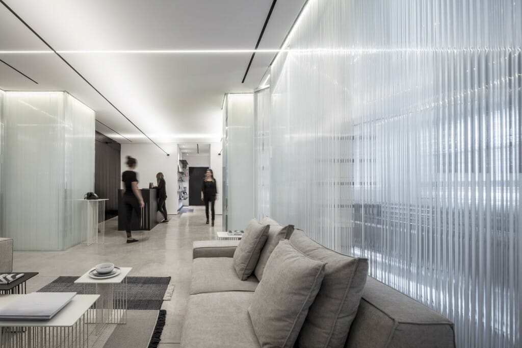 לשם יצירת החוויה בחלל השקענו לא מעט זמן בפיתוח פרט של קירות זכוכית המורכבים משכבות של זכוכית בעוביים שונים, שחוברו יחדיו לקירות ורטיקליים. 12 ק״מ של פסי זכוכית מרכיבים את המחיצות הפריזמטיות שמייצרות שקיפויות מעניינות ושלל אפקטים של שבירה והסטת קרני אור המשתנים במהלך היום. הייתי מאוד מרוצה מההתגייסות הן של הלקוח והן של בעלי המקצוע ל״שגעון״ הזה, והעבודה המשותפת הוכיחה את עצמה.