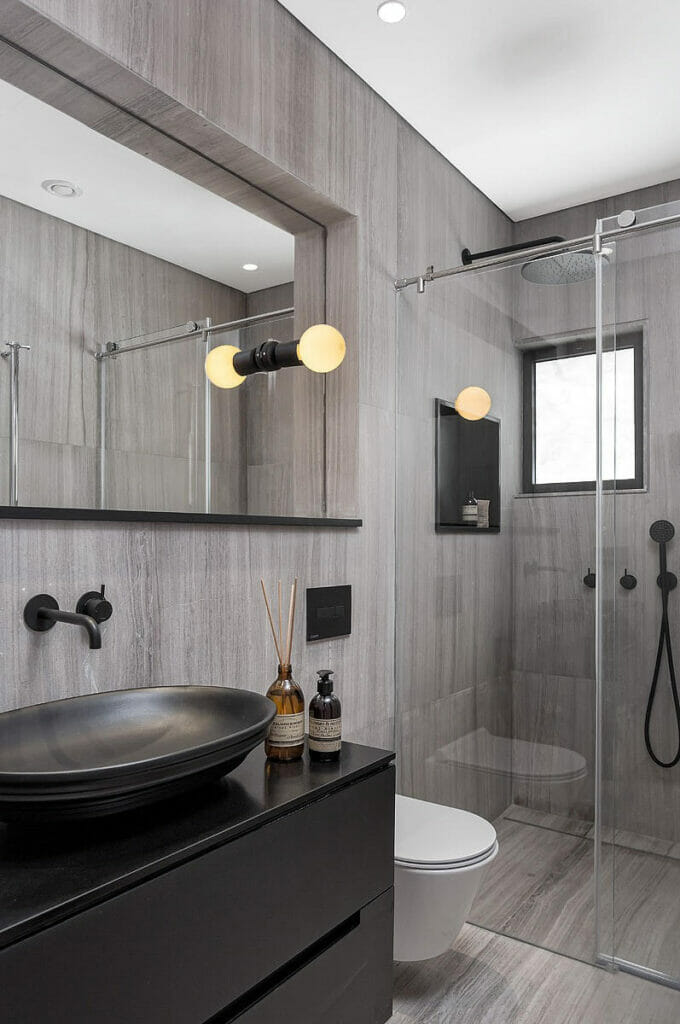 העבודה עם אבן קיסר לא הצטמצמה למשטחים בחללים הרטובים אלא נעשתה גם באלמנטים נוספים ודקורטיביים. ״פרטי הפינות בקרמיקה ופורצלן לא עוברים את סף התכנון שלי״, הוא מסביר, ״ולכן אני מעדיף להשתמש באבן קיסר שמבחינתי הכי קרובים לחומר טבעי מבחינת העיבודים ופרטי הקצה״.