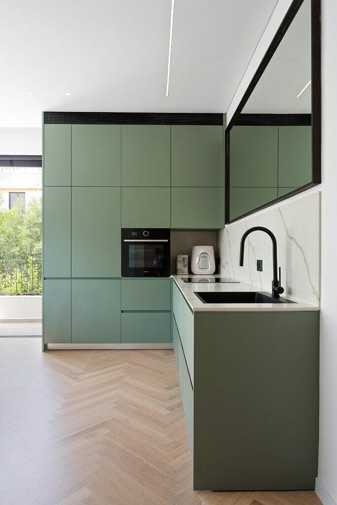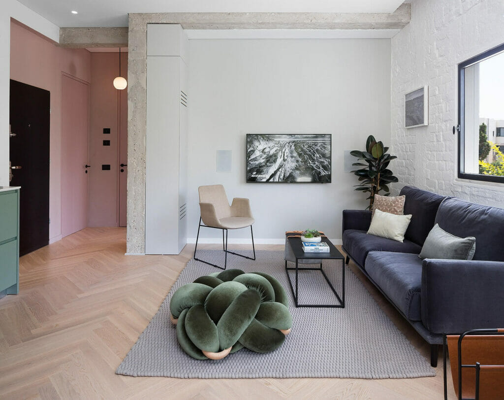 ״כחלק מהרעיון העיצובי־שיווקי של הדירה החלטנו לאפשר לעצמנו להכניס צבע אחר שבדרך כלל אנחנו לא משתמשים בו בדירות מגורים סטנדרטיות: גווני ורוד וירוק בנגרות, בטון חשוף, צבעי קירות ושימוש בטקסטיל וריהוט צבעוני. מכיון שהאבן שבה בחרנו לחיפוי הקירות מאוד דומיננטית, החלטתי שבנישות נשתמש דווקא במשהו מנוגד ולכן בחרתי בדגם 3100 השחור של אבן קיסר."