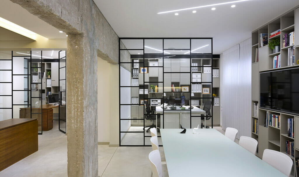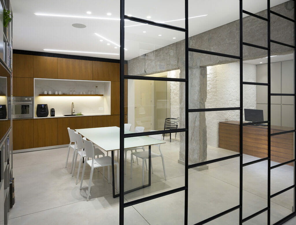 כך לדוגמה, כשתכנן משרד יזמות נדל״ן בחלל מרתף ששימש בעבר כאולם התעמלות, האתגר העיקרי היה לתכנן חלל עבודה פתוח ככל האפשר על מנת לנצל את מעט האור הטבעי הנכנס למשרד במרתף. כהאן השתמש בחומרים טבעיים כמו בטון, עץ וברזל בשילוב משטחי אבן קיסר. בתכנון המטבח במשרד יצר נישה ואת כולה חיפה – תחתית, קירות וגג – בדגם 5131 של אבן קיסר. בחדר הרחצה הוא חיפה גם את הנישה של המראה וגם את הנישה בתוך המקלחון באותו משטח.