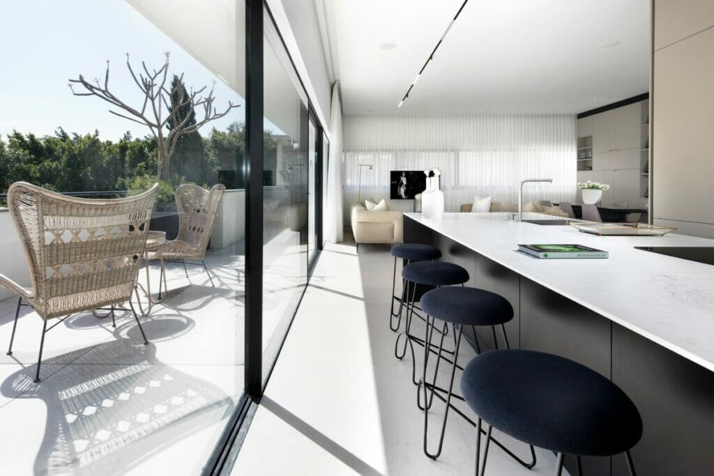 כשתכנן דירת פנטהאוז עם בריכת שחיה על גג בנין לשימור, הוא השתמש בפלטת גוונים מונוכרומטית כרקע להלבשה עתידית של הבית על ידי הלקוח שירכוש את הדירה . ״השימוש באבן קיסר נתן לי מענה גדול: את המטבח כמובן שחיפינו בדגם 5131. דיקקנו את החומר, וכך קיבלנו מראה נקי ויוקרתי. את הכיורים והמשטחים בחדרי הרחצה ושרותי האורחים בנינו כשוקת מאבן קיסר בדגמים 5100 ו 5031.