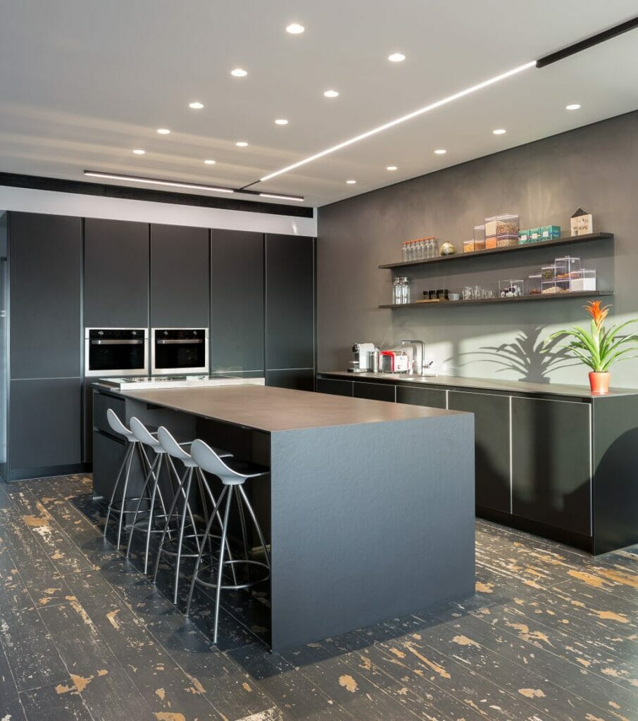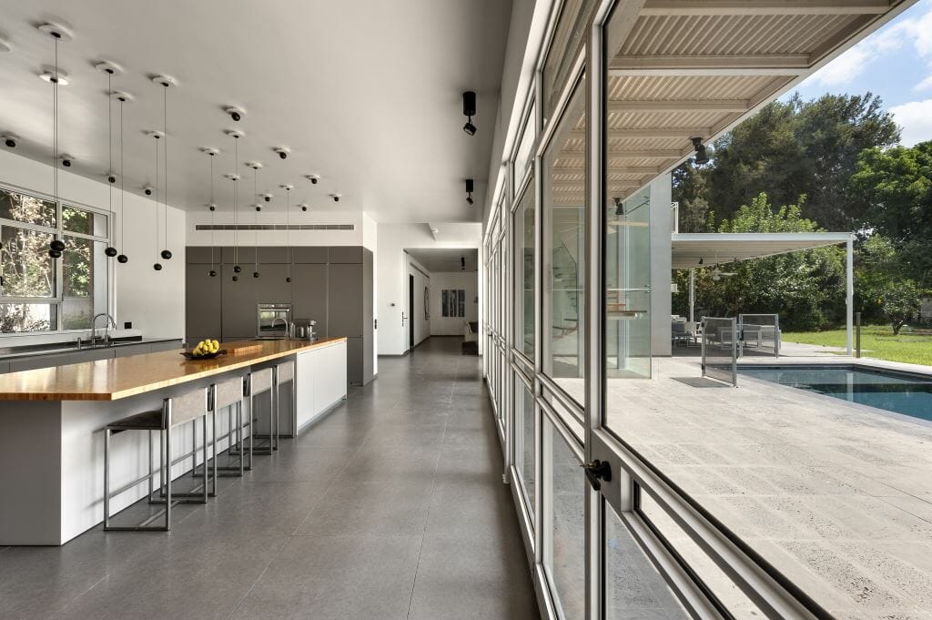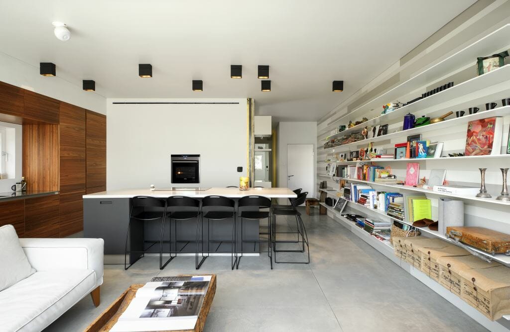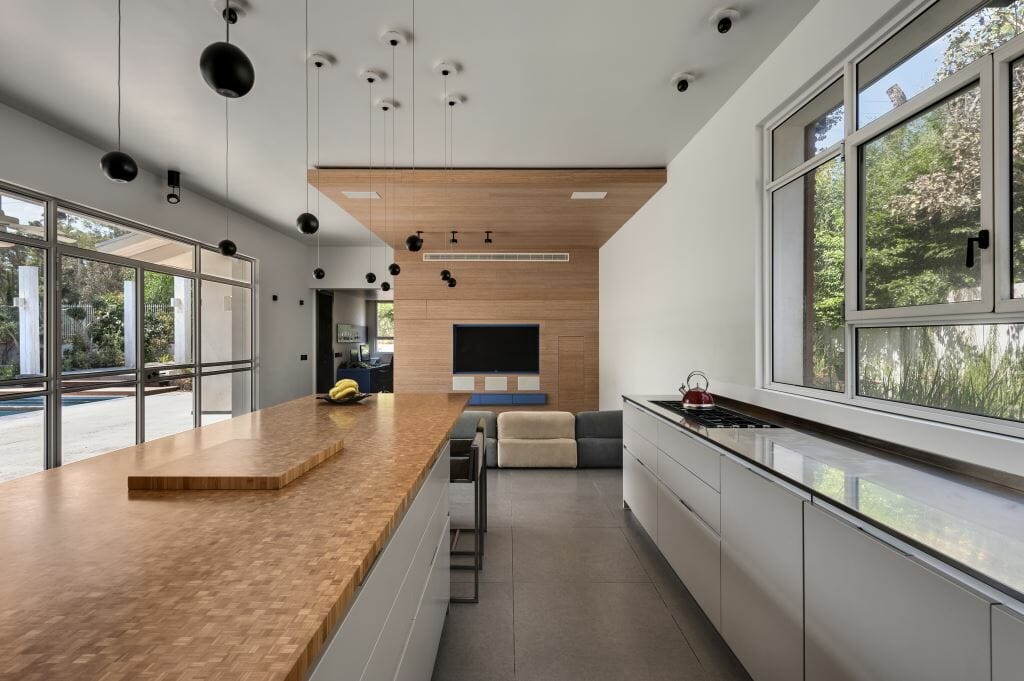 שימוש נוסף שעשה באבן קיסר אפשר למצוא במטבח שנמצא בכניסה לדירה בתל אביב. קיר אחד של המטבח מכוסה כולו בארונות עץ גבוהים, כולל תנור ומקרר בילט אין, ונישת אכסון צבועה באדום בוהק, שבולטת מהמטבח למסדרון הכניסה. ״לא רצינו שזה יהיה סתם קיר אלא שיהיו בו אלמנטים של חשיפה והסתרה. משטח העבודה והכיור הבנוי מאבן קיסר, ביחד עם ארונות המטבח השחורים ממול, נותנים את הבמה לעץ ולא גונבים לו את ההצגה״.