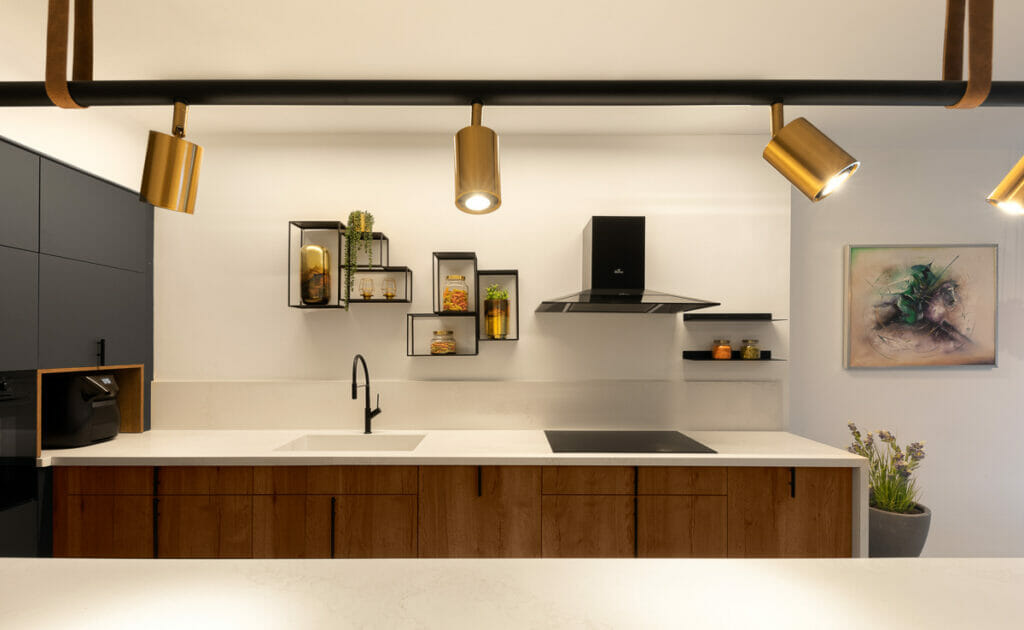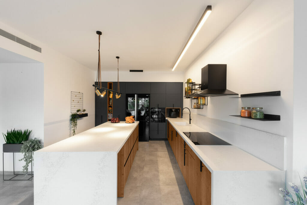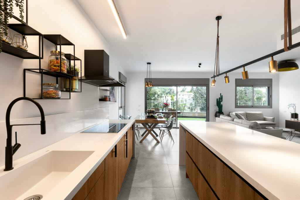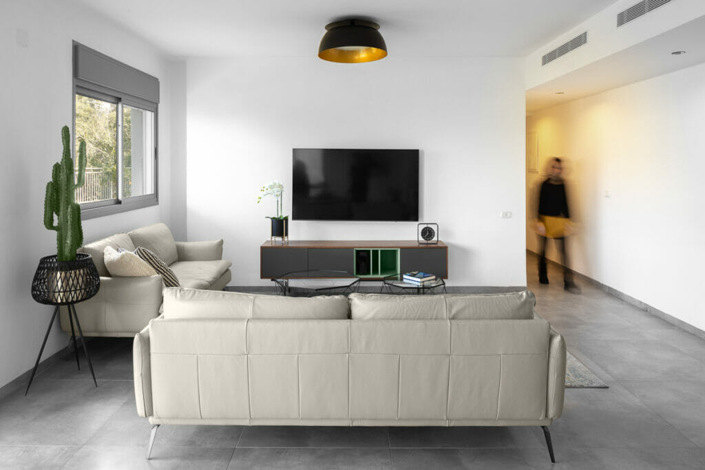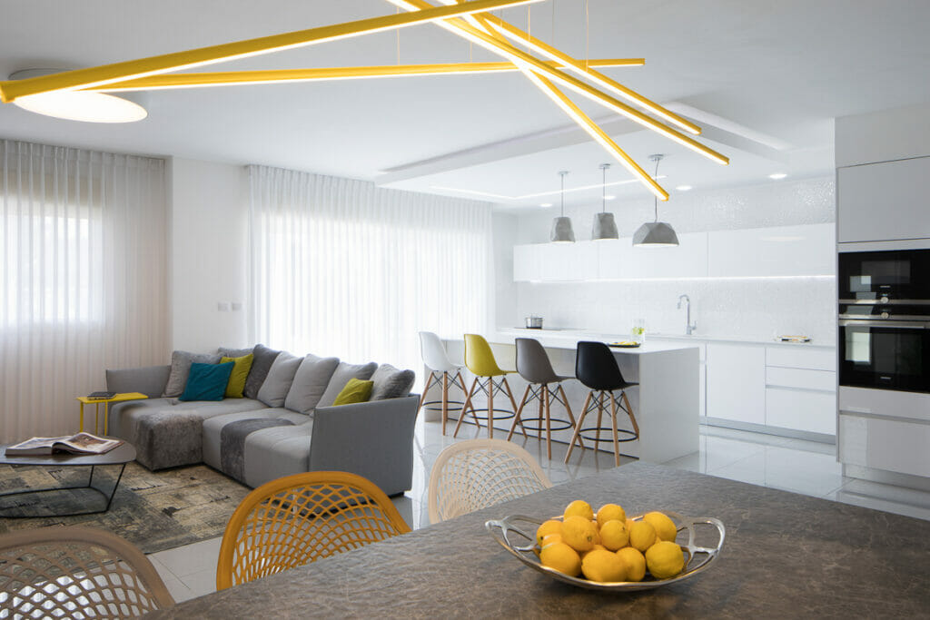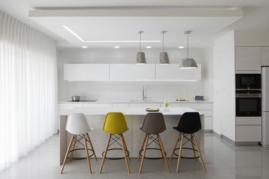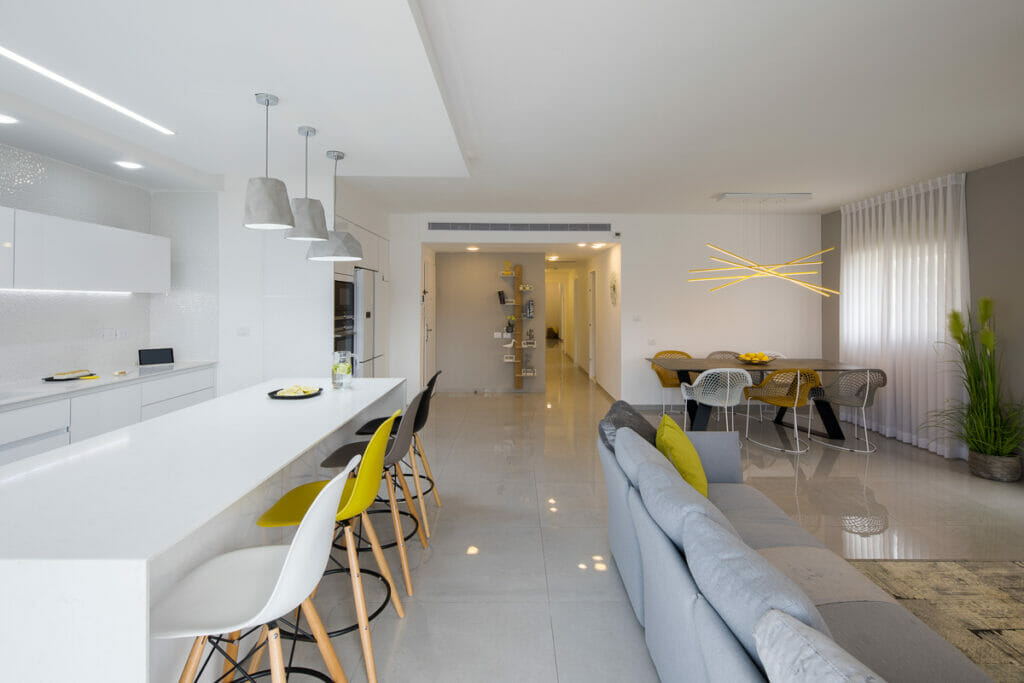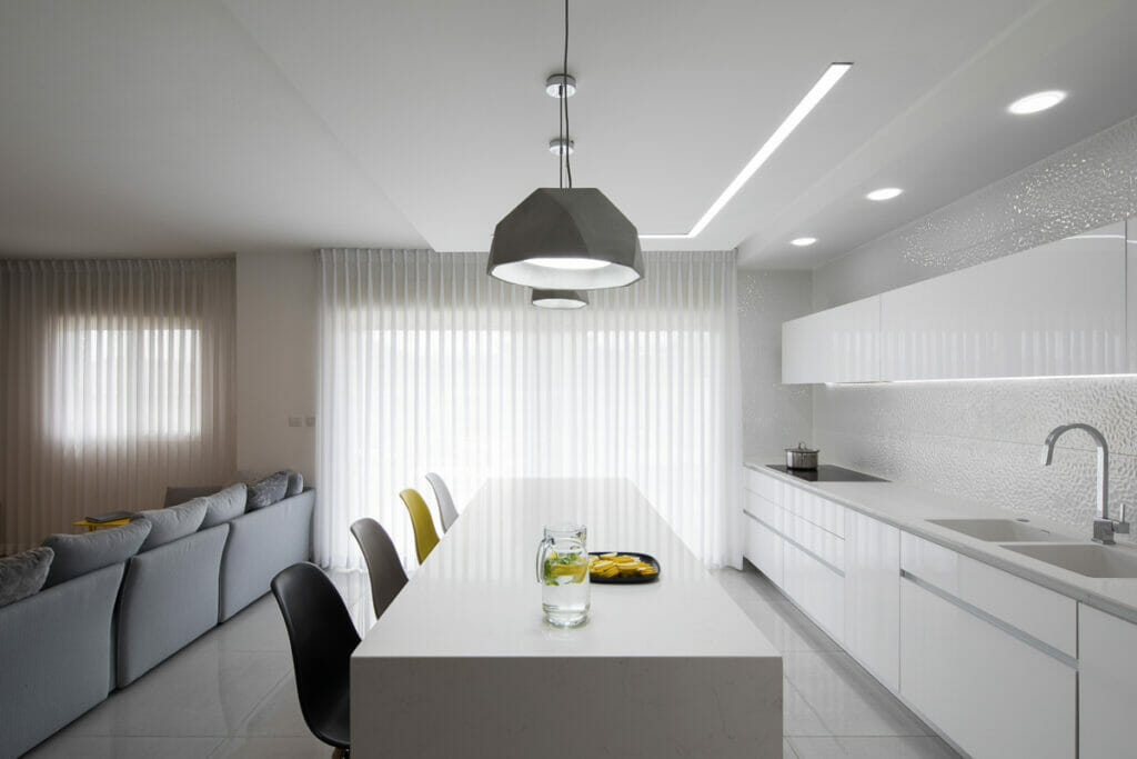 כל הדירה עוצבה בגוונים בהירים, מודרנים וכמעט מינימליסטים עם נגיעות צבע בולטות. המטבח כולו לבן וכדי שלא יהיה מנוכר מדי, נבחרו למשטחי ההעבודה ולאי דגם 5141 של אבן קיסר מסדרת העורקים, כדי לשמור על הגוון הלבן מצד אחד, ומצד שני להכניס עניין.