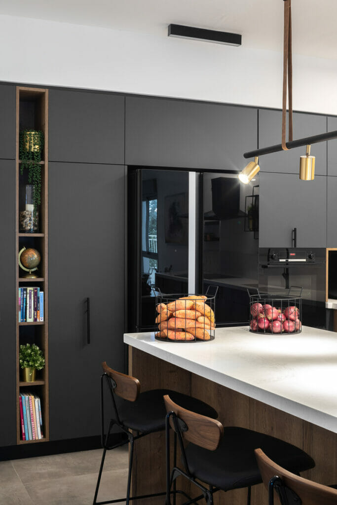 למטבח בחרה מנגד בדגם 5131 של אבן קיסר, ״שמצד אחד משתלב נהדר עם הגוונים האפורים של העורקים שיש בתוכו בעיצוב הדירה כולה, ומצד שני מרגיע מעט את הגוונים הכהים והבולטים של המטבח עצמו. כדי לא להכניס עוד חומר למטבח, גם החיפוי נעשה באותו משטח כדי ליצור מראה אלגנטי ואחיד. תכונות החומר איפשרו לי לחפות את המטבח אופקית ואנכית עם חיבור 45 מעלות למראה אחיד, יפה ועל זמני".