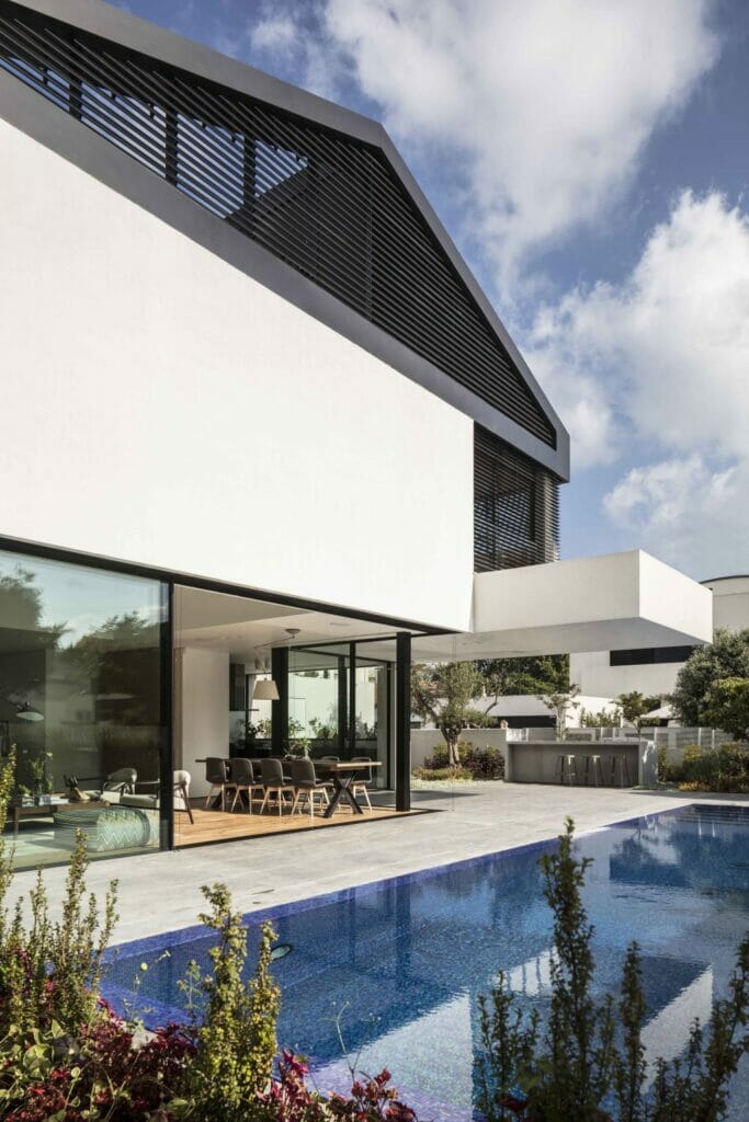 ״הגישה האדריכלית היא עכשווית, מבחינת הצורה, החומרים והצבעים, ומתבססת על חיבור בין נפחים לבנים, אטומים ונקיים, לנפחים שחורים, אווריריים ושקופים, עשויים אלומיניום. הקונטרסטיות בין שני הצבעים, החומרים והאלמנטים הצורניים, יוצרת חזיתות דרמטיות עם משחקי אור והשתקפות. המטבח עדיין משקף את החומריות התעשייתית המלוטשת עם ארונות נירוסטה גבוהים, יחידת ארונות שחורים ואי מרכזי עם משטח אבן קיסר מדוקק.