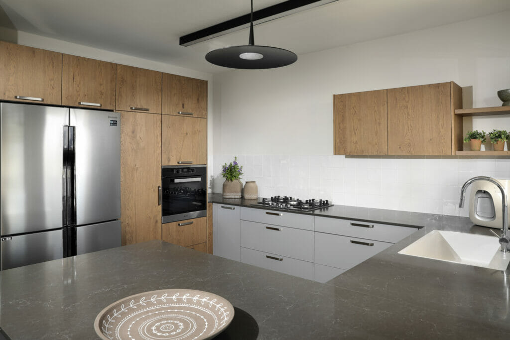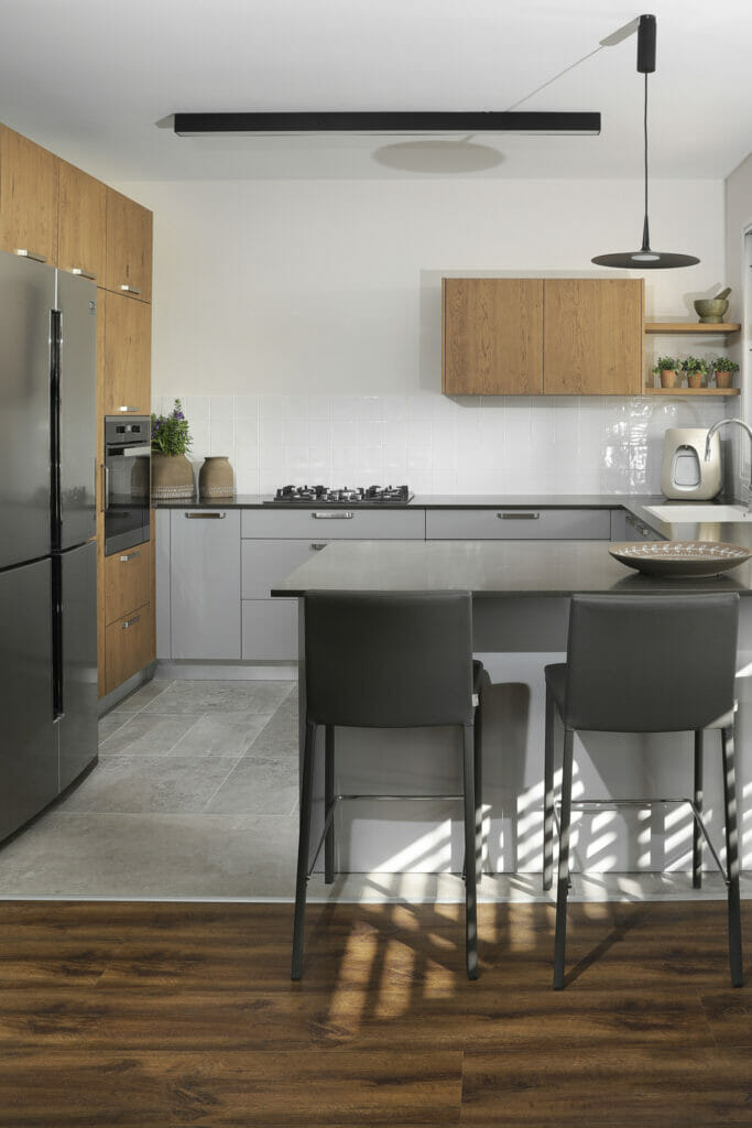 כך לדוגמה, כשתכננה דירה בתל אביב ושינתה את כל החלוקה הפנימית שלה, היא השתמשה בגוונים שחוזרים על עצמם בחיפויים ברצפה ובקירות. במטבח היא שילבה משטח כהה של אבן קיסר, שיצר עם העץ והגוונים האפורים מסביב ״דרמה יפה ומזמינה, תעוזה שיש בה הרמוניה ותחושה נעימה. אני אוהבת קלאסיות, שאותם חומרים חוזרים על עצמם, שיש בחלל קצב של חזרה״.