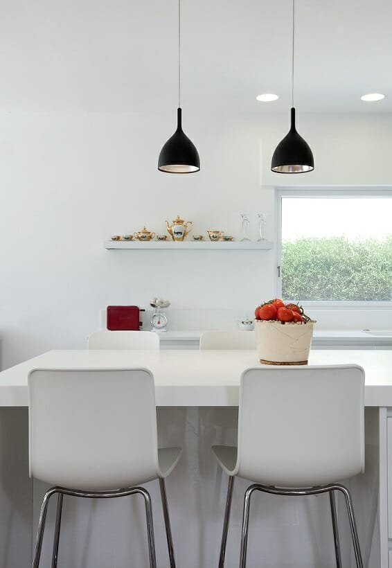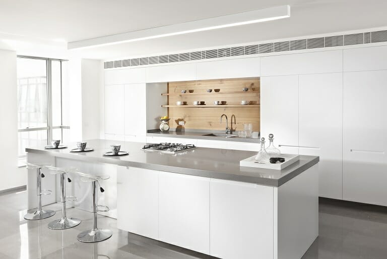 ארונות לבנים במיוחד יוצרים פני שטח בוהקים ומשקפים, אשר באמת פותחים את החדר, והוספה של מתקני נירוסטה לשילוב הזה, מעודדת את האור לרצד על כל פני השטח.