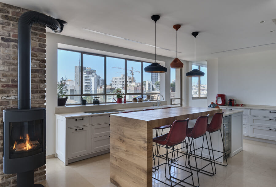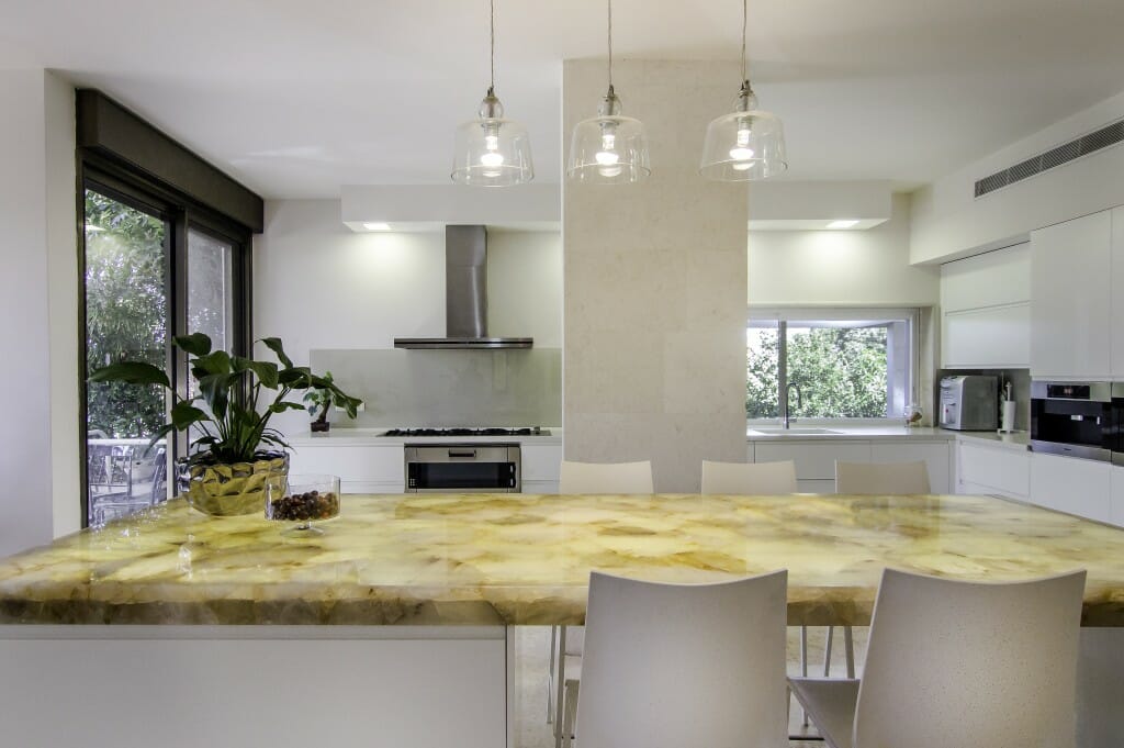 ״היה חשוב שגם המטבח ישתלב עם שאר הבית, לכן בחרתי להשתמש באי במשטח קונצ׳טו של אבן קיסר, עם תאורת לד מתחתיו שמאפשרת לשלוט בעוצמת התאורה״, היא אומרת. ״לקונצ׳טו יש את החמימות של החומר הטבעי, בנוסף לכך שהוא עמיד ויפהפה. מגוון הצבעים של אבן קיסר מאפשר אין־סוף עיצובים, ואהבנו במיוחד את העובדה שהוא יפה גם בלי התאורה מתחתיו. עם התאורה הוא בכלל wow…״.
