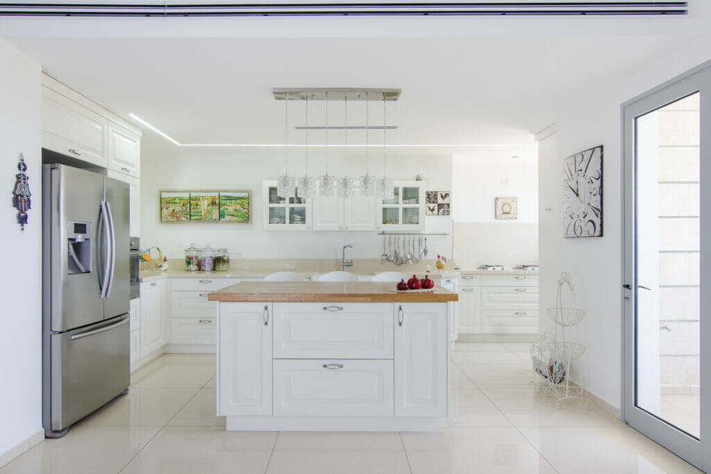 במטבח השתמשה שחוריי במשטחי אבן קיסר בגימור מקור ציפור, ״שמשתלבים בצורה מושלמת עם הסגנון הכפרי־לייט של המטבח. בסגנון הכפרי הכבד יש המון קווים, פה בחרנו להשתלב עם המראה הבהיר של ארונות המטבח ולהדגיש את האי. אני אוהבת שילובים של חומרים טבעיים