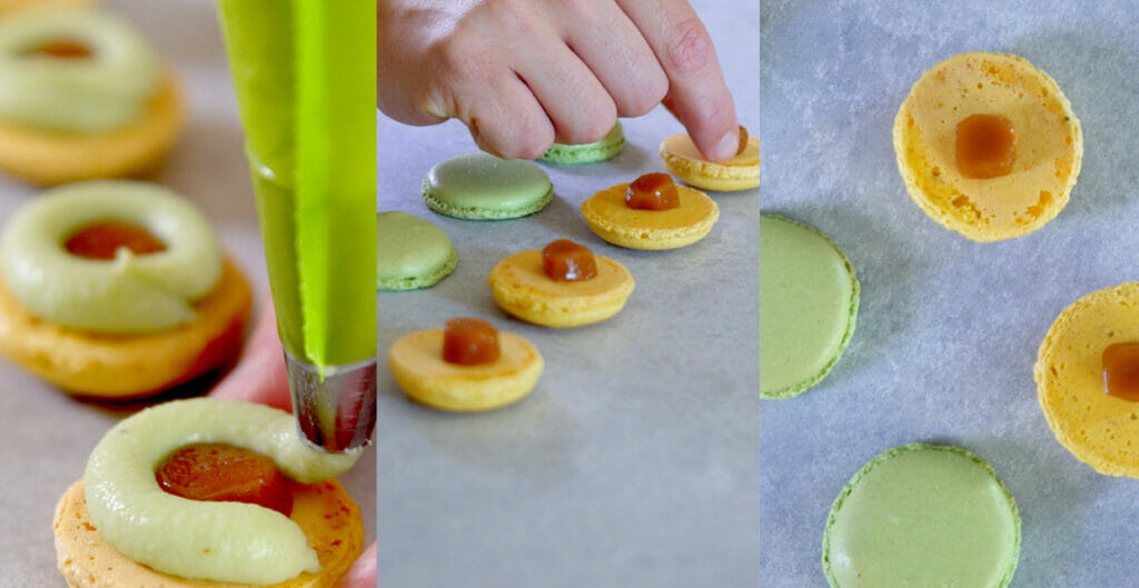 10. מתאימים זוגות של מקרונים. מסדרים על עוגייה אחת חתיכת קרמל דבש וסביבה מזלפים קרם תפוח. מניחים מעל את העוגייה השנייה ליצירת סנדוויץ'. מומלץ לתת לעוגיות לשהות לילה במקרר, כך הן מתרככות ומפתחות את המרקם הייחודי שלהן.
