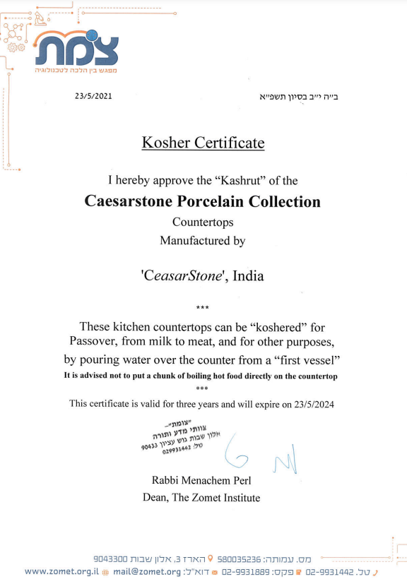 בעמוד זה מוצגת תעודת "אישור הלכתי-טכנולוגי" לכשרות משטחי אבן קיסר פורצלן מתוצרת מפעל ליולי בהודו